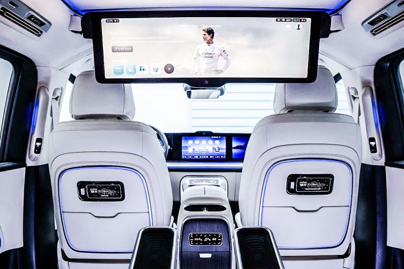 VLE의 진짜 매력은 다양한 첨단 편의 장비에서 드러납니다. 2열과 3열 승객을 위해 제공되는 31.1인치 8K 천장형 디스플레이는 미니밴에서는 보기 어려운 수준의 사양입니다. 이 디스플레이에는 8MP 카메라가 함께 탑재되어 화상 회의 기능도 사용할 수 있습니다. 이동 중에도 업무나 영상 통화를 할 수 있도록 설계된 것입니다.