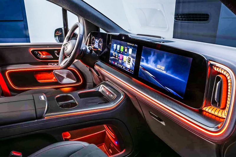 대시보드에는 세 개의 대형 디스플레이가 적용됩니다. 10.3인치 디지털 계기판과 14인치 인포테인먼트 화면 그리고 14인치 조수석 인터랙티브 디스플레이가 하나의 파노라마 형태로 배치됩니다. 이러한 구성은 최근 벤츠 전기차에서 강조되는 디지털 콕핏 디자인을 그대로 반영한 모습입니다.